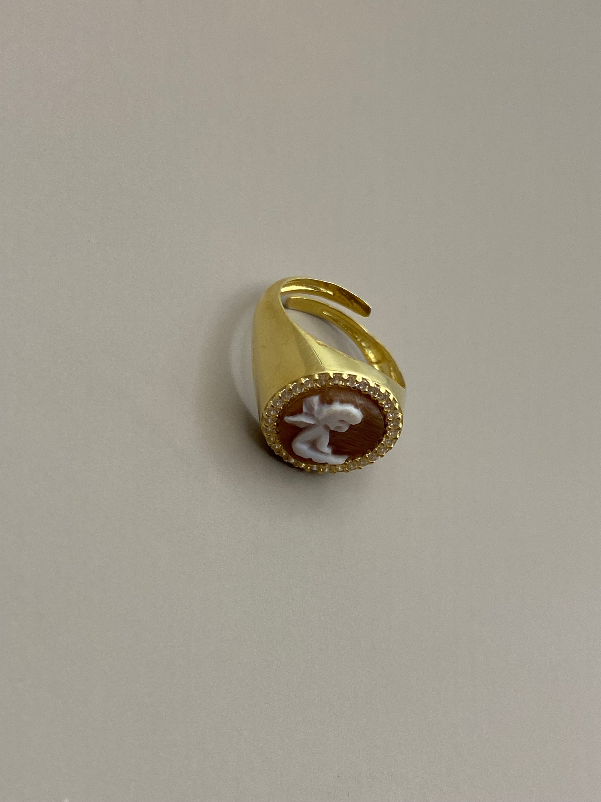 Anello "Angelo seduto" di cammeo, montato su argento bagnato oro e lavorato a mano da artigiani.