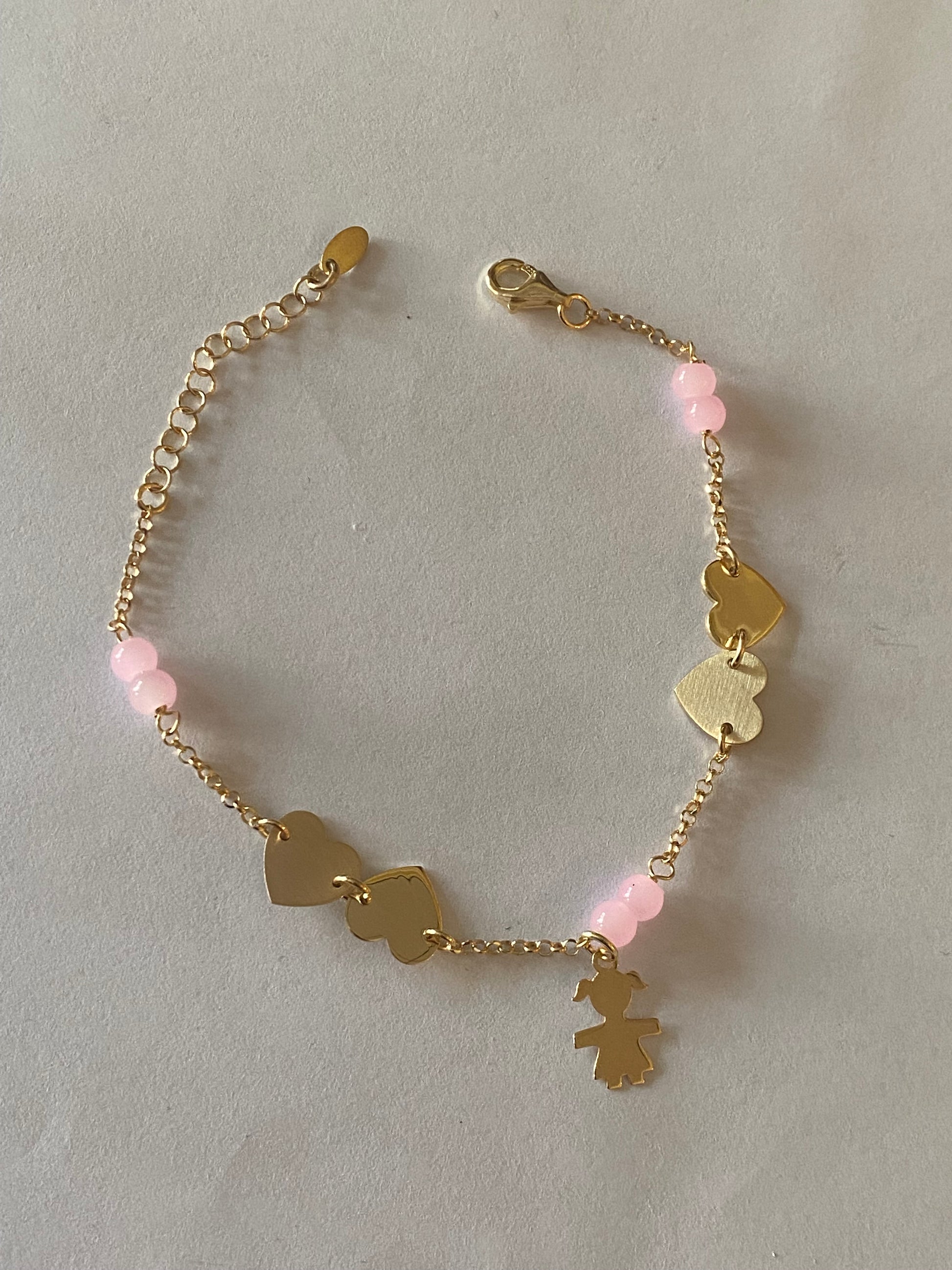Bracciale in Argento 925 galvanica Oro giallo con cuoricini, ciondolo pendente Bimba e pietre rosa.
