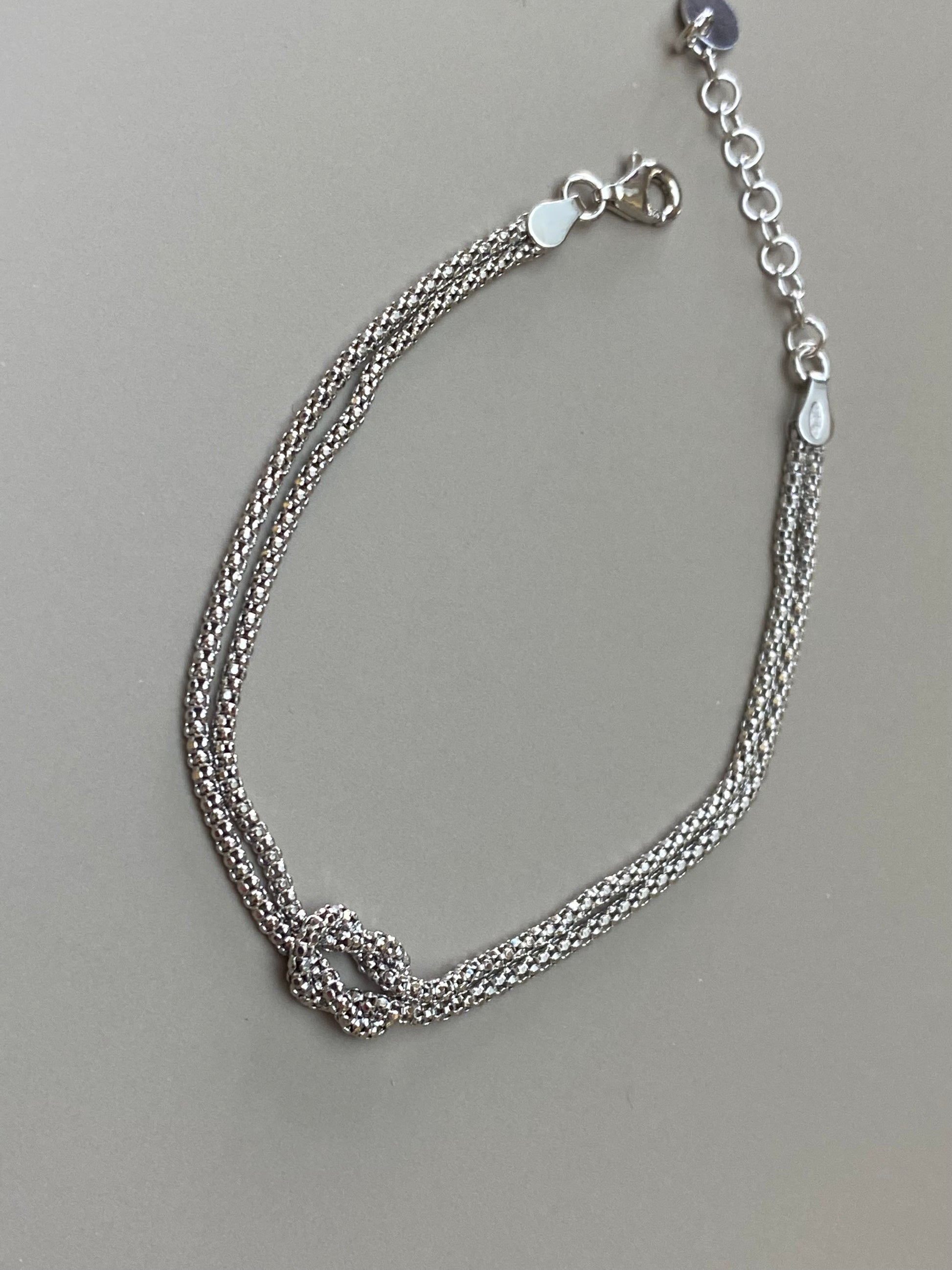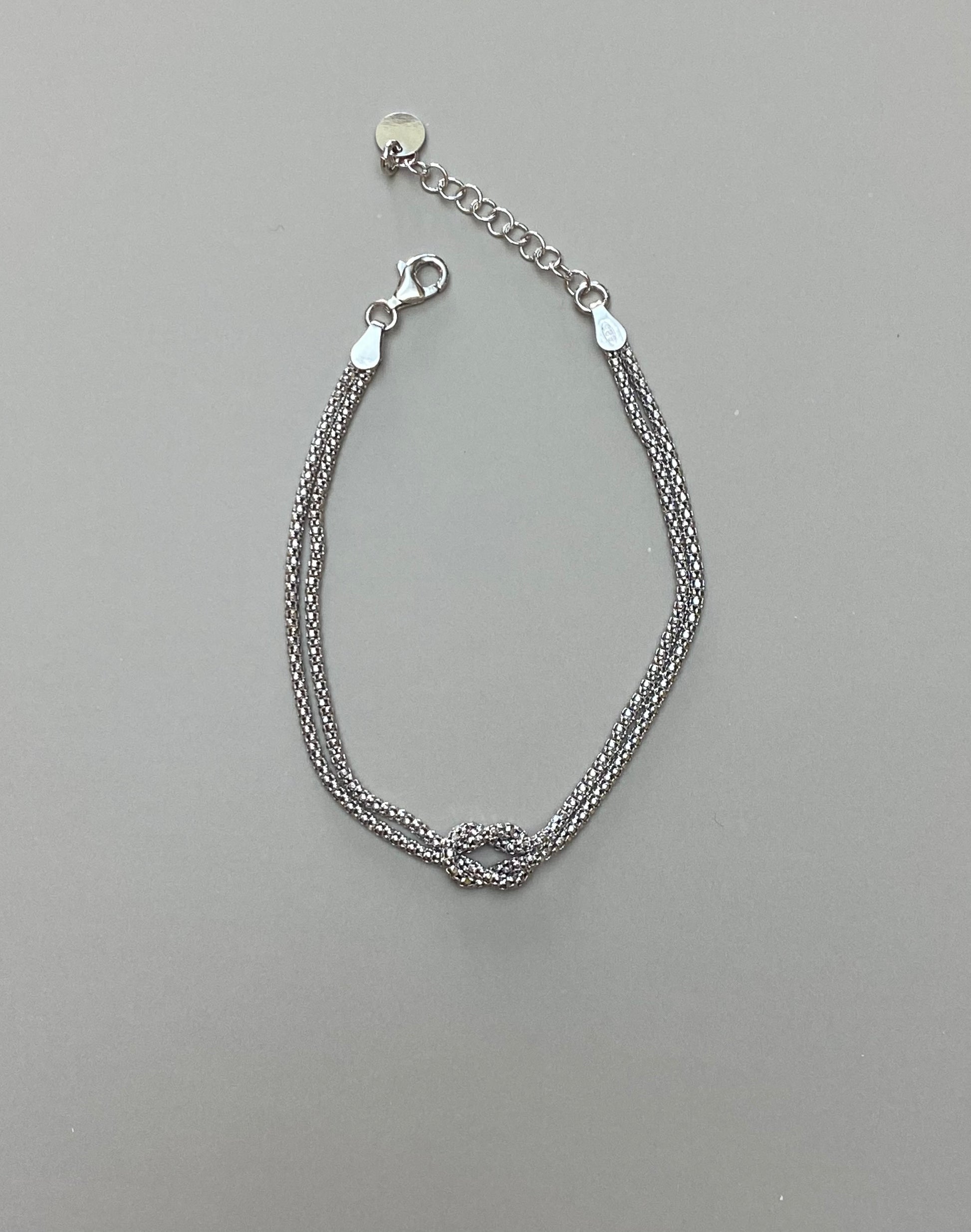 Un intreccio di due catene in argento rodiato 925, che si uniscono in un nodo prezioso.