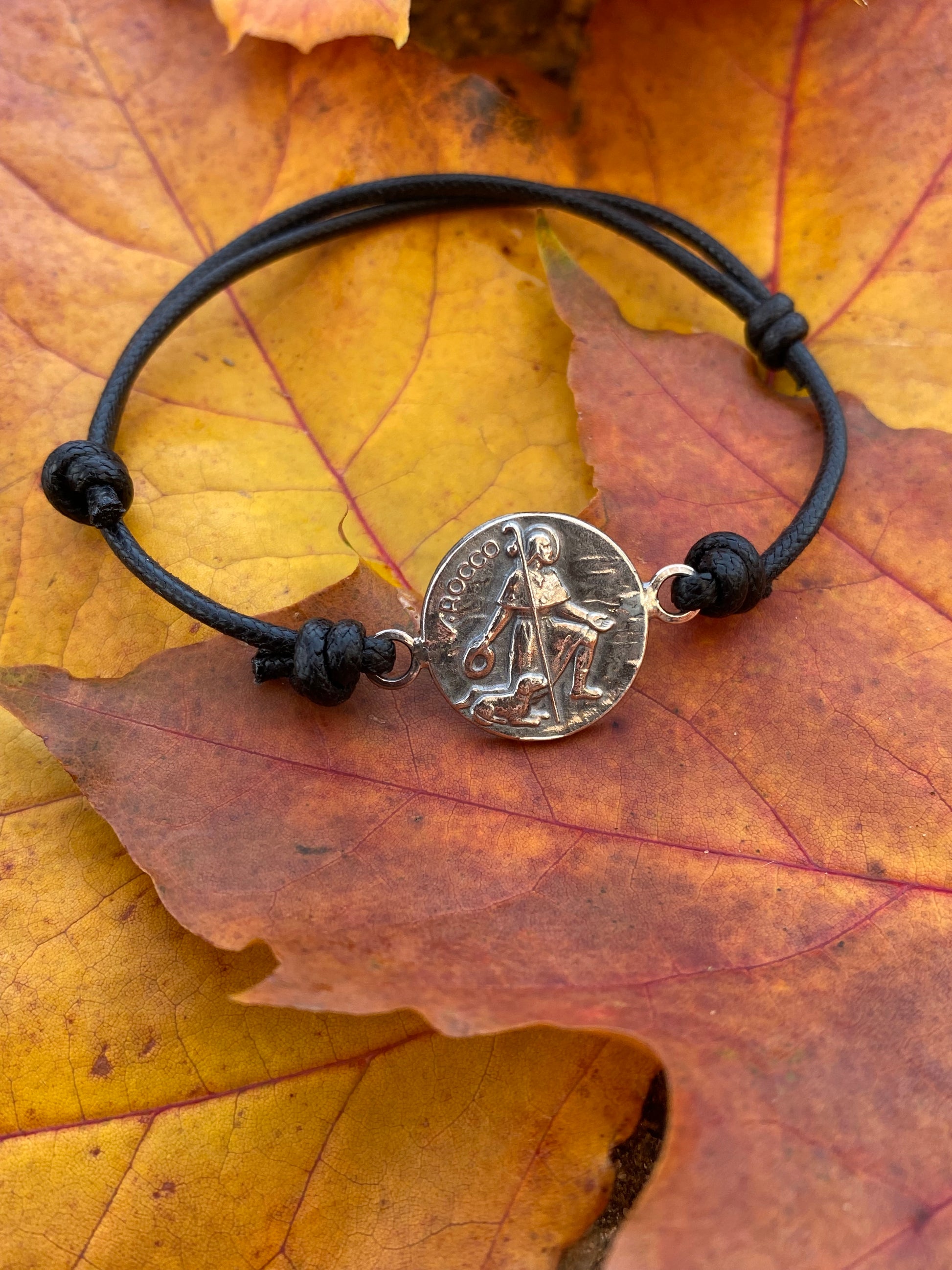 Un segno di fede profonda e protezione quotidiana: il bracciale realizzato artigianalmente in corda cerata nera, con ciondolo in argento brunito 925 dedicato a San Rocco, protettore di Bocchigliero.