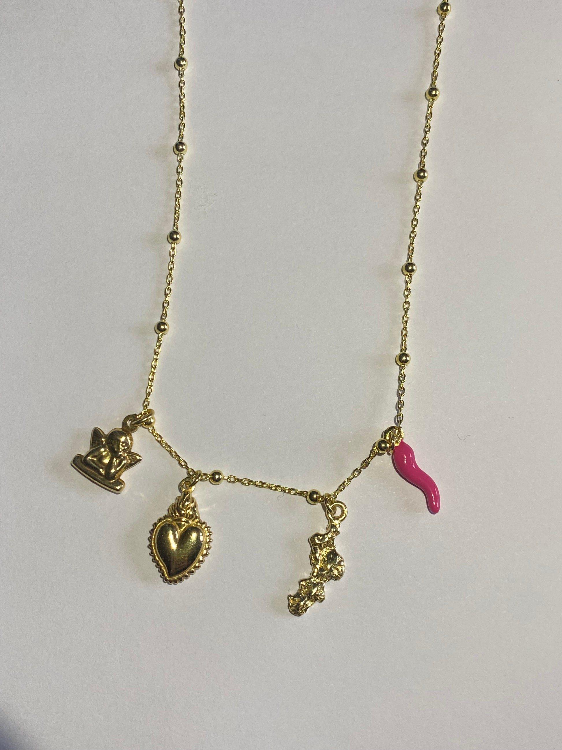 Collana con sfere in argento 925 dorato, Sagoma della Calabria in rilievo, cornetto portafortuna, Angelo di Raffaello e Cuore Sacro.
