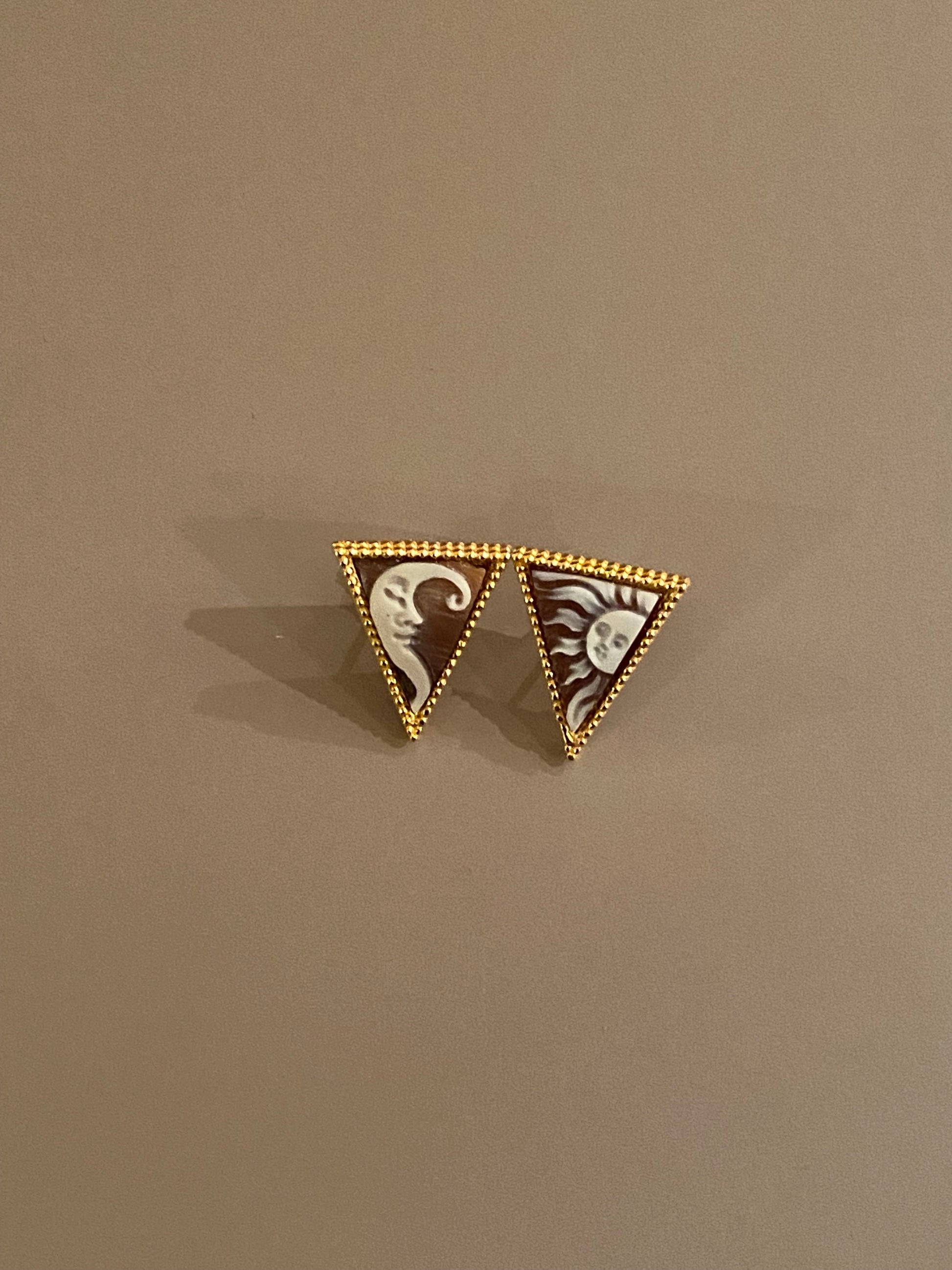 Orecchini triangolari in argento 925 galvanica oro realizzati con conchiglia sardonica e incisi a mano da maestri orafi di Torre del Greco con i simboli del sole e della luna.