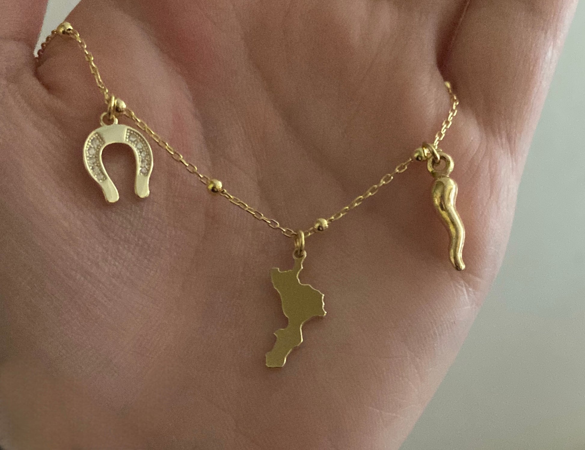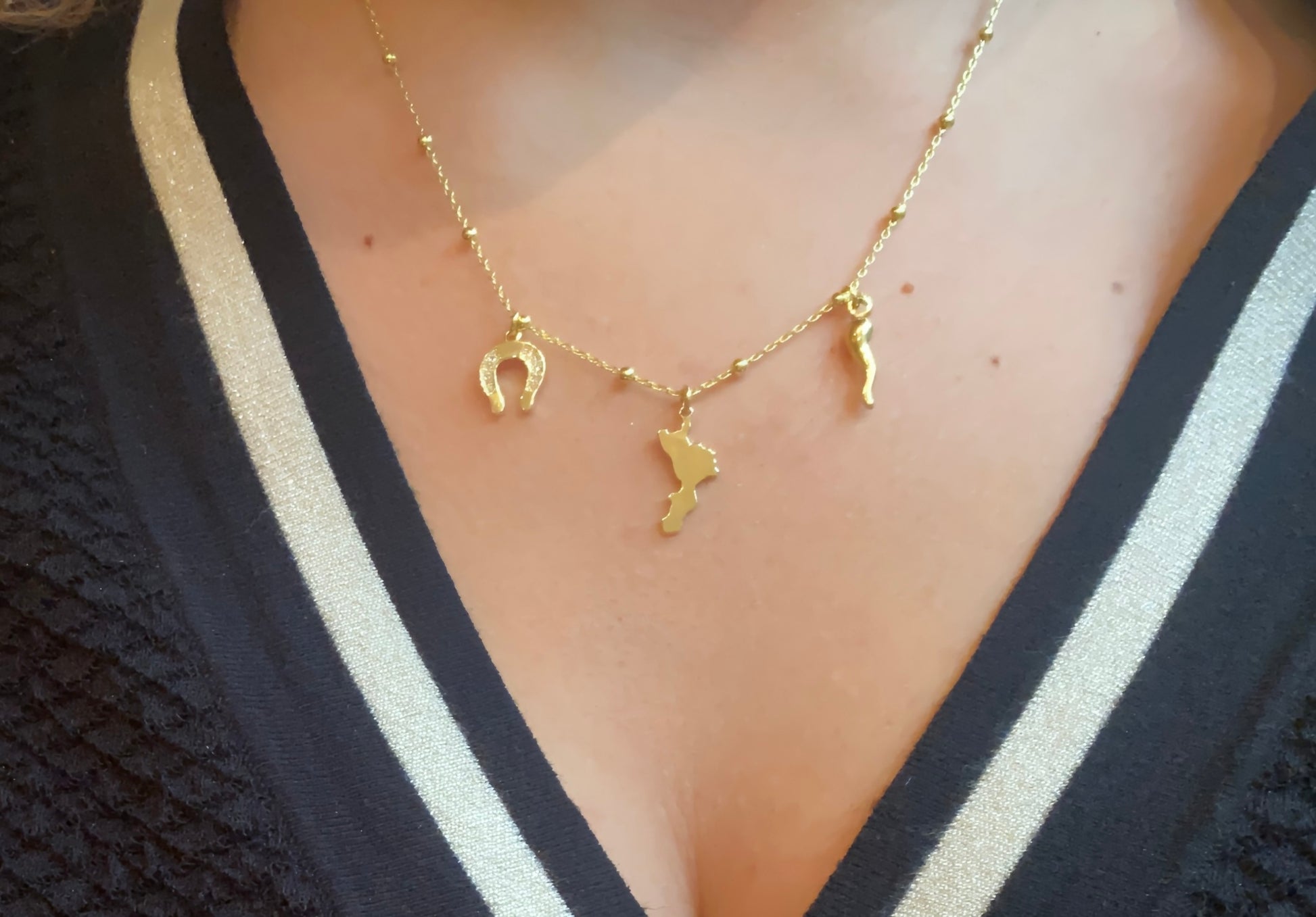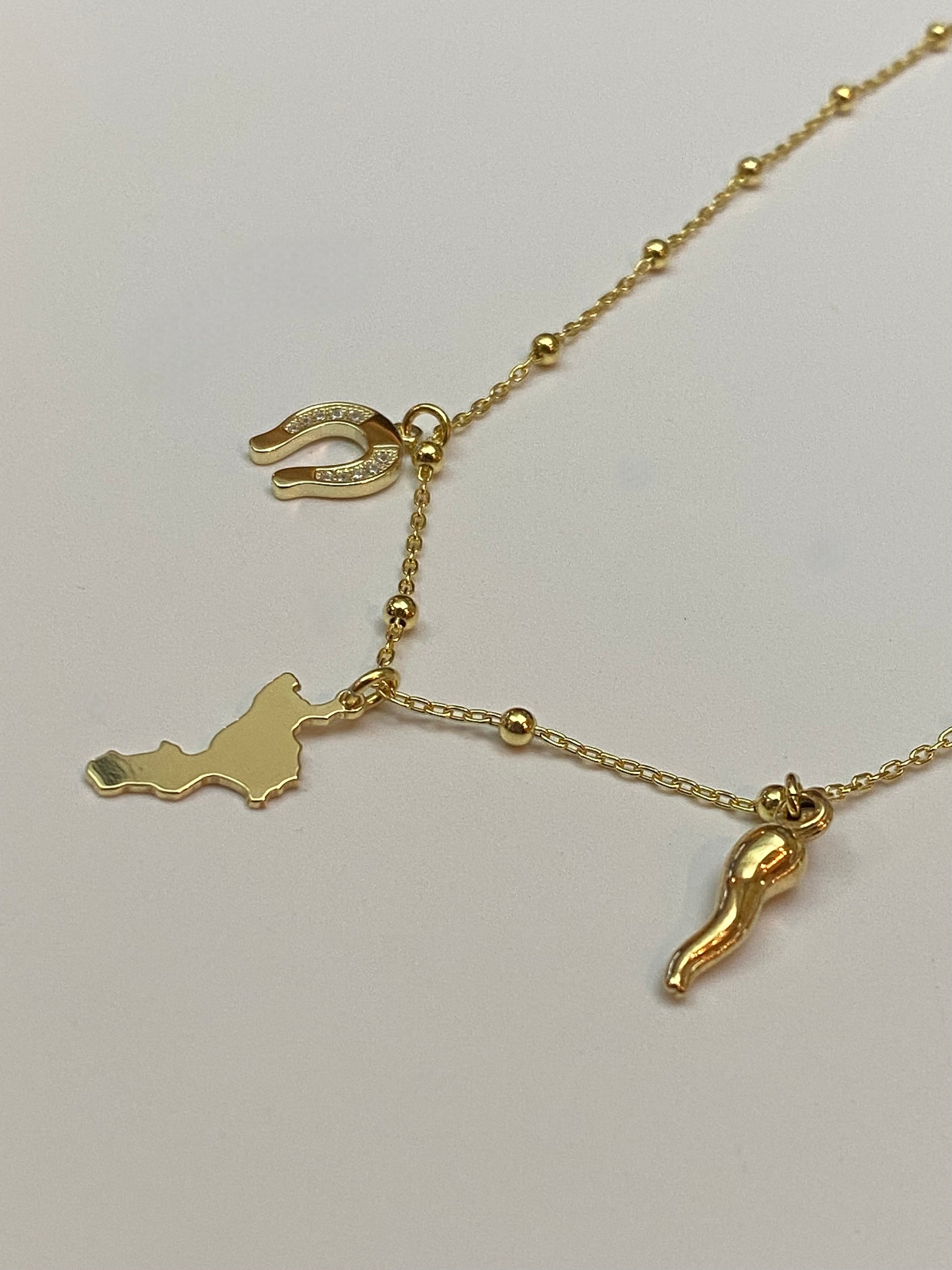 Girocollo radici di Calabria con sfere in argento 925 bagnato oro e tre ciondoli simbolici: